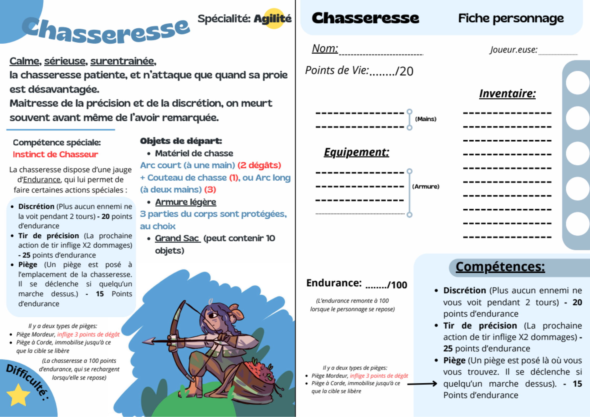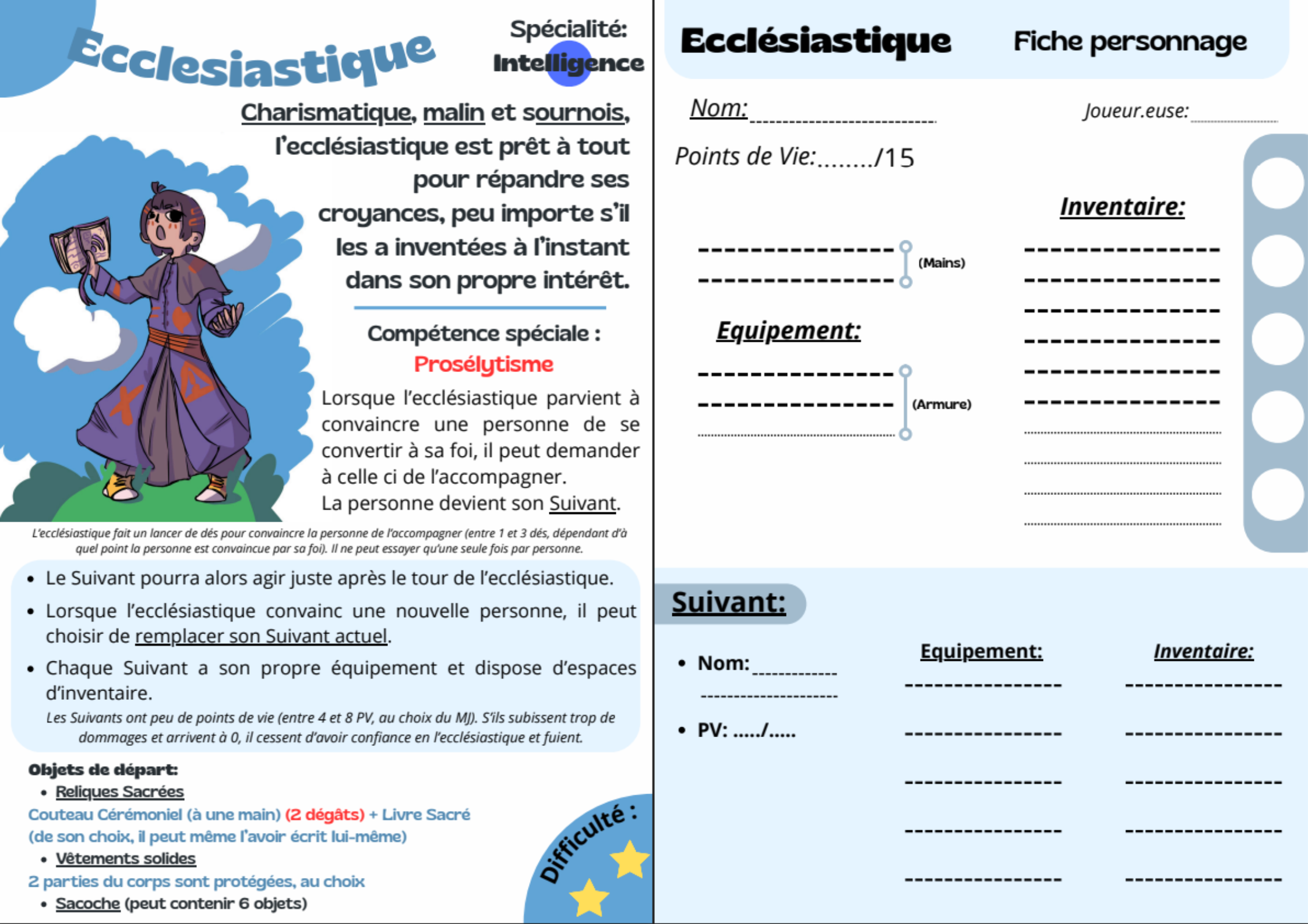 - 6 classes, allant du Chevalier vaillant à la Pêcheuse patiente, en passant par l'Ecclésiastique manipulateur.